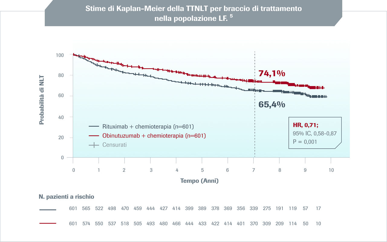 G-chemio, Gazyvaro®+chemioterapia; HR, hazard ratio; IC, intervallo di confidenza; LF, Linfoma Follicolare; MZL, Marginal Zone Lymphoma; NHL, linfoma Non-Hodgkin; R-chemio, rituximab+chemioterapia; TTNT, tempo al successivo trattamento anti-linfoma; HR, Rischio elevato; IR, Rischio Intermedio; LR, Low Risk (basso rischio); iNHL, indolent Non-Hodgkin's Lymphoma; OS, Overall Survival (sopravvivenza globale); PFS, Progression-Free Survival; EFS, Event-Free Survival.