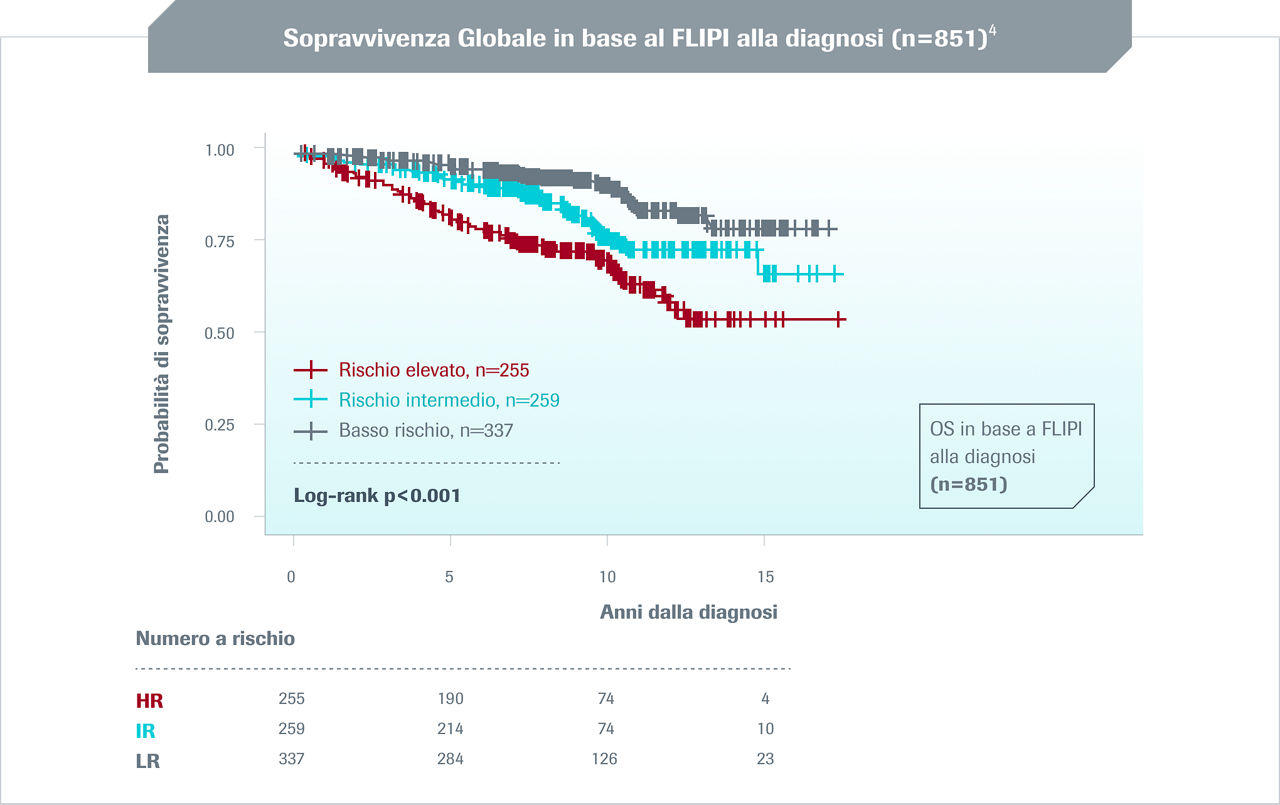 ° Studio retrospettivo condotto su 1088 pazienti con FL di grado 1-3 gestiti tra il 1998 e il 2009.4 Gli outcome dei pazienti sono stati analizzati mediante OS, PFS e EFS.4 La OS è stata calcolata sia dal tempo della diagnosi o dal tempo di inizio del trattamento fino all'ultimo follow-up o al decesso.4 I tempi di PFS ed EFS per linee di terapia sequenziali sono stati calcolati dall'inizio del trattamento fino all'evento qualificante (progressione o decesso per la PFS; progressione, cambio di trattamento, o decesso per la EFS).4 Il punteggio FLIPI dei pazienti è stato valutato alla diagnosi e all’inizio del primo trattamento.4