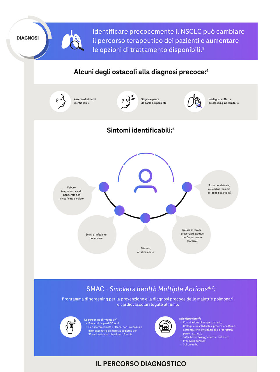 NSCLC: non small cell lung cancer; PET: tomografia a emissione di positroni; TAC: tomografia assiale computerizzata; TC: tomografia computerizzata; RM: risonanza magnetica; SMAC: Smokers health Multiple Actions.