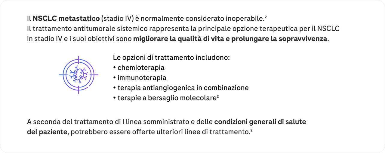 2. Cancer.org. What is non small cell lung cancer? Disponibile presso: https://www.cancer.org/cancer/lung-cancer/about/whatis.html#:~:text=Non%2Dsmall%20cell%20lung%20cancer,of%20lung%20cancers%20are%20NSCLC. Ultimo accesso: 10/2022.